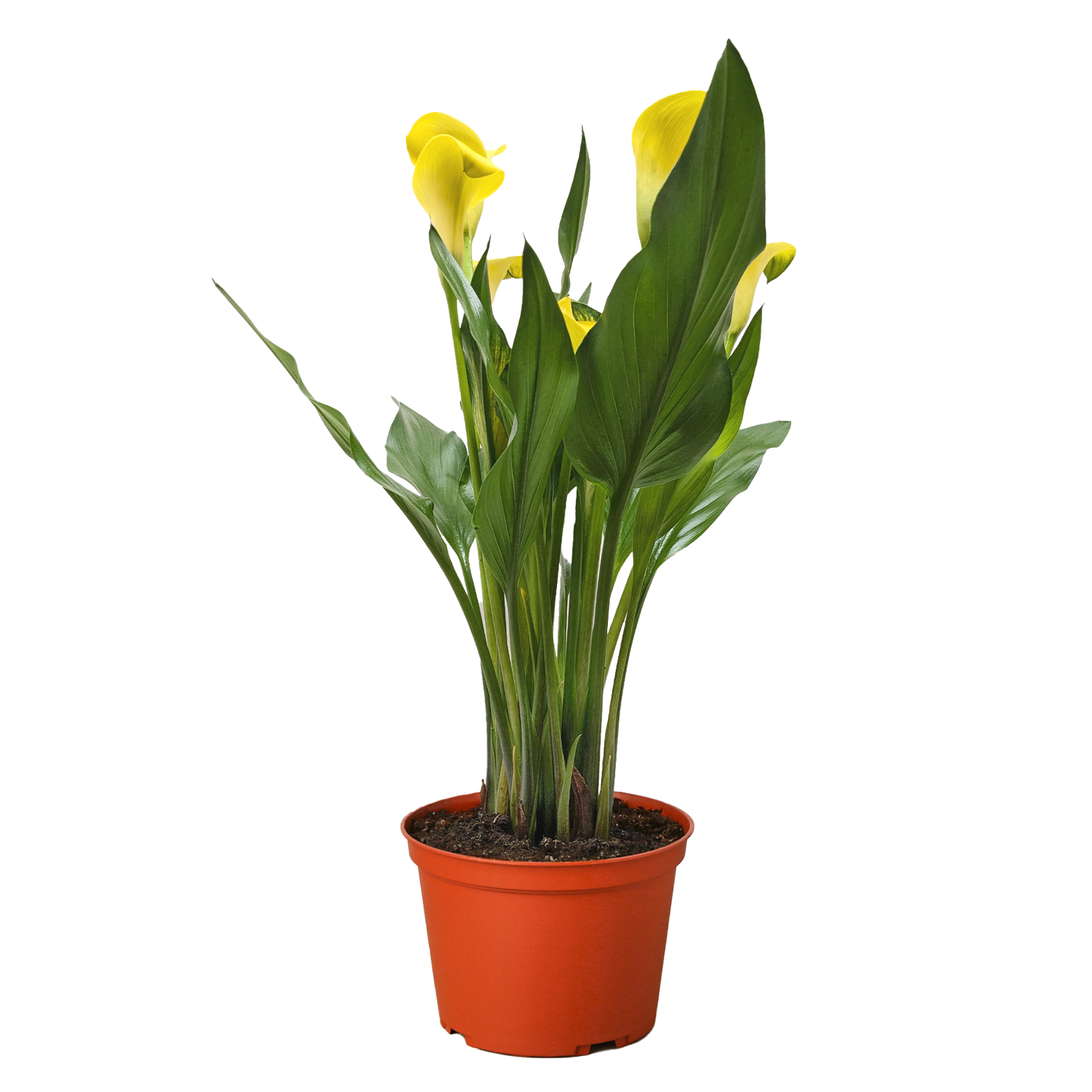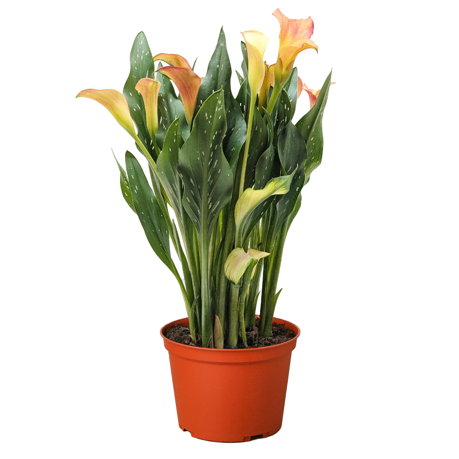 Calla Lily (Zantedeschia) features stunning elegant trumpet-shaped blooms in vibrant colors atop lush green arrow-shaped foliage. This easy-care flowering plant grows from rhizomes and brings sophisticated beauty indoors or outdoors, combining dramatic blooms with surprisingly simple care requirements. Perfect for anyone who wants elegant flowers with minimal effort.